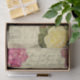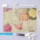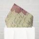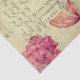 Ephemeral design includes old handwriting and french post stamps. Pink hydrangea and garden roses in red and yellow on yellow aged background.
