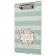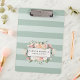 Elegant floral clipboard features your name and/or business name framed by a border of lush watercolor flowers in blush pink, sage green, peach and cream, on a background of tone on tone sage green stripes. Matching business cards and accessories are available below or in our shop.