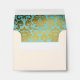 Elegant ivory coloured wedding thank you note card envelope, with a gold edge on the backflap. Graphics of an antique gold and sky blue damask pattern lines the inside. Golden brown text, on the back flap, is ready to personalise with your return address. Lovely finishing touch to our Antique French Damask Wedding Thank You note cards.