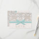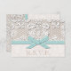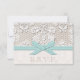 Pretty and ladylike antique lace look vintage lace wedding response cards and RSVP with a printed dainty, aqua and mint blue contrast stitch ribbon look design and a subtle creamy coconut off white damask background. Designed by Chrissy H. Studios, LLC. All Rights Reserved.