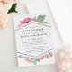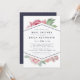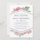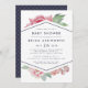 Elegant baby shower invitations feature a chic mix of vintage watercolor florals and modern geometric elements on a crisp white background. A spray of blush pink watercolor peony flowers peeks out from the top and bottom of a central diamond shaped element outlined in midnight blue, holding your baby shower details in clean, modern lettering. Cards reverse to midnight blue with a subtle dotted diamond pattern. A beautiful contemporary design in a luxe colour palette of blush, navy and sage green.