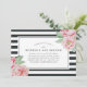 Elegant floral Mother's Day brunch, lunch or dinner invitations feature a charcoal and white striped background accented with blush pink watercolor peony flowers and sage green leaves. Customise with your brunch or party details in matching charcoal grey lettering.