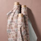 This holiday fabric features a delicate seamless pattern design of soft blush pink, ivory, cream, rose and white fussy antique Victorian Era ephemera Christmas themed illustrations from yesteryear, on a faint powder pink background. Graphic depictions include Santa Claus, winter snowscapes, a train, a church, Christmas presents, a decorated Xmas tree, a child, a bird, seasonal foliage, festive garlands, elaborate frames, and more.