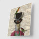 Vintage dictionary page with print of a vintage rabbit wearing a colourful suit. The vintage animal illustration also has colourful vintage birds. The background is an original antique dictionary page.