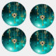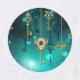 Gold, antique keys with gears and dials hang on gold chains on luminous green background.