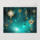 Gold, antique keys with gears and dials hang on gold chains on luminous green background.