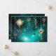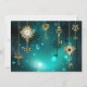 Gold, antique keys with gears and dials hang on gold chains on luminous green background.