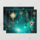 Gold, antique keys with gears and dials hang on gold chains on luminous green background.