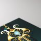 Gold, antique keys with gears and dials hang on gold chains on luminous green background.