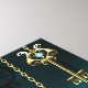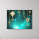 Gold, antique keys with gears and dials hang on gold chains on luminous green background.