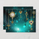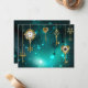 Gold, antique keys with gears and dials hang on gold chains on luminous green background.