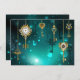 Gold, antique keys with gears and dials hang on gold chains on luminous green background.
