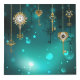 Gold, antique keys with gears and dials hang on gold chains on luminous green background.