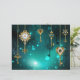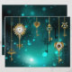 Gold, antique keys with gears and dials hang on gold chains on luminous green background.
