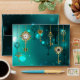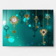 Gold, antique keys with gears and dials hang on gold chains on luminous green background.