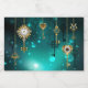 Gold, antique keys with gears and dials hang on gold chains on luminous green background.
