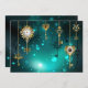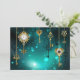 Gold, antique keys with gears and dials hang on gold chains on luminous green background.