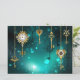 Gold, antique keys with gears and dials hang on gold chains on luminous green background.