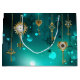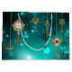Gold, antique keys with gears and dials hang on gold chains on luminous green background.