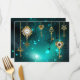 Gold, antique keys with gears and dials hang on gold chains on luminous green background.