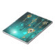 Gold, antique keys with gears and dials hang on gold chains on luminous green background.