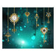 Gold, antique keys with gears and dials hang on gold chains on luminous green background.