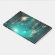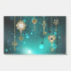 Gold, antique keys with gears and dials hang on gold chains on luminous green background.