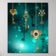 Gold, antique keys with gears and dials hang on gold chains on luminous green background.