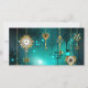 Gold, antique keys with gears and dials hang on gold chains on luminous green background.
