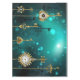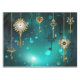Gold, antique keys with gears and dials hang on gold chains on luminous green background.