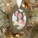 Oval Christmas photo ornament surrounded by an antique style frame and holly.
