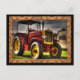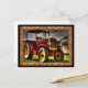 This vintage tractor has a old brown steal roof cover on it. With old yellow metal rims.The body id red and the front grill is yellow.You can see the grey clouds and green grass.This postcard has a wood floor brown frame and the black background. The background colour can be change to any colour you want it to be with the custom tag.This postcard you can add text at the same time..