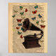 Antique vintage Grammophone on an antique vintage dictionary page. The word music is highlighted on the dictionary page. Streaming and flying out of the antique Grammophone are a lot of colourful butterflies also done in a vintage style or antique butterfly illustration style.