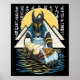 Illustration of Anubis, ancient god of Egypt, represented in the Nile river in front of the Giza Pyramids, holding a pharaoh's sarcophagus in his arms.