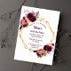 On front: An invitation for a 50th or any age birthday party. A white background with a faux gold geometric frame. Decorated with dark purple and burgundy flowers, roses and boho style feathers. Templates for a name, age and party details. The name is written with a hand lettered style script, purple coloured letters.