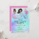 Girl's mermaid birthday invitation for any age with a girly glitter design. Kids' birthday party invite with black-haired mermaids and a watercolor with faux glitter background. Change the pink back colour by clicking the button to edit the design.