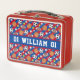This sports metal lunch box with a multi ball sports pattern is able to be any colour you want or you can keep the red/blue colorway. In the customisation area you can change the stripes and/or background colour to your favourite colours or your favourite team’s colours. This can be one or two colours. You can also make the sports ball pattern and star pattern on this lunch box larger or smaller in the tilling area. Personalise this metal lunch box with a first or last name and a player number. This is a fun gift to give sports fans.