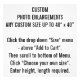 Any Custom Size Photo Enlargements to Personalise. Choose your own size. Customisable dimensions. Maximum 40" x 40". Minimum 4" x 4". DESIGN YOUR OWN: Fully customisable Photo Print Enlargements. Add your own words, text, image and personalise your photo enlargements. CHOOSE YOUR OWN CUSTOM SIZE: Choose a custom size from 4" x 4" up to 40" x 40". Just click the drop down "Size" menu above "Add to Cart". Scroll to bottom of Menu. Then click "Choose your own size". Enter height and length required. Create your own customisable, personalised photo print enlargement gifts and products for a birthday, for Christmas, for marketing and promotional use, or simply for your home or yourself. Add your own text, name, words, pattern, motif, monogram (monogramme), image or personal design. Ideal for making photo posters. Various standard and custom frame options available.