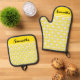 Any Name Cute Floral Daisy Pattern Oven Mitt & Pot Holder Set. Features pretty yellow and white daisy pattern. A fresh, happy look with cute daisies to brighten your day. Add your choice of name for a truly personalised touch.