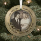 Celebrate a joyful golden 50th wedding anniversary with a custom photo "Married 50 Years" black and gold round glass Christmas ornament. Picture and all text on this template are simple to personalize. (IMAGE & TEXT DESIGN TIPS: 1) To adjust position of wording, add spaces at beginning or end. 2) To center the photo exactly how you want, crop it into a square shape before uploading to the Zazzle website.) Design features a gold faux foil border, stylish vintage art deco style typography, the couple's names & date, and one picture of your choice. This unique & modern wedding keepsake adds an elegant touch to Xmas home decorations. Please note that gold is printed color, not metallic foil. Congratulations & Happy Fiftieth Anniversary!
