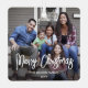 Celebrate the simple joys of the holidays with a custom 2 photo overlay square metal ornament. Pictures and all text on this template are easy to customise and can be different or the same on front and back. It can include any wording, such as Merry Christmas, Happy Holidays, My First Xmas, Best Friends, kids & family names, etc. (IMAGE PLACEMENT TIP: An easy way to position a photo exactly how you want is to crop it before uploading to the Zazzle website.) The black and white design features trendy modern brushed script calligraphy, simple minimalist typography names & year, and two photos of your choice. This unique keepsake adds a stylish touch to Xmas home decorations. Merry Christmas!
