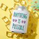 A charming and uplifting design featuring the inspirational phrase "Anything is Possible" in soft light teal, accented with two sets of delicate pink hearts to spread positivity and love.