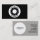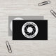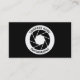 A business card template with an aperture symbol in a white circle with curved text company name and business type. Company name and business type on the front, with name and other contact details on the reverse using the white circle panel without the aperture symbol for the name and job title, arranged to the left side.