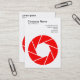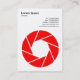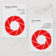 A business card template with a bold aperture symbol. Company name, business type and address on the front with name, job title, telephony, web and email addresses on the back, with the same layout.
