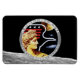 Apollo 17 was the final mission of the NASA Apollo lunar landing program, and was the sixth and last landing of humans on the Moon. The insignia is contains an image of the Greek sun god Apollo, an American eagle, red bars representing the U.S. flag; and three white stars symbolising the three astronaut crewmen; Eugene Cernan, Ronald Evans, and Harrison Schmitt. The background shows deep space, the Moon, the planet Saturn, and a spiral galaxy.