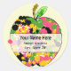 An address label for teachers or anyone else who likes apples. Features an illustration of an apple covered in pink, green, yellow, and black paint splatters. Personalise sheer centre of apple with your name and address.