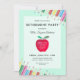 This colourful retirement party invitation is design for a teacher. The background is light green accented with a graphic of coloured pencils and a red apple.