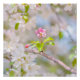 Closeup view of an apple tree in full bloom. Single pink apple flower on a twig against and amidst other flowers of soft pink colour and light blue sky. The impression of purity and beauty. The painting of the Nature. Textured photograpy.