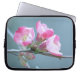 A photograph of an apple tree branch with pink apple blossoms on a blue/grey background.