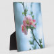 A photograph of red apple blossoms on a branch during a warm Spring day.